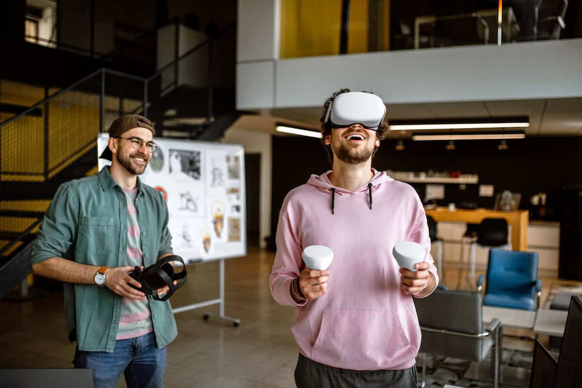 Three gaming & extended reality experts looking at game designs at gaming staffing firm
